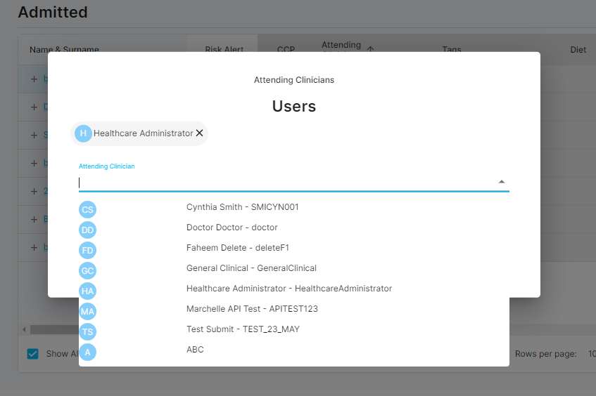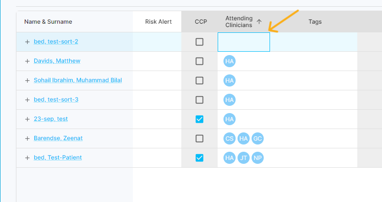Once you've allocated all your patients to yourself, achieve this by clicking on the "Attending Clinicians" column and choosing your name from the provided dropdown list.