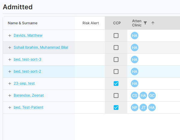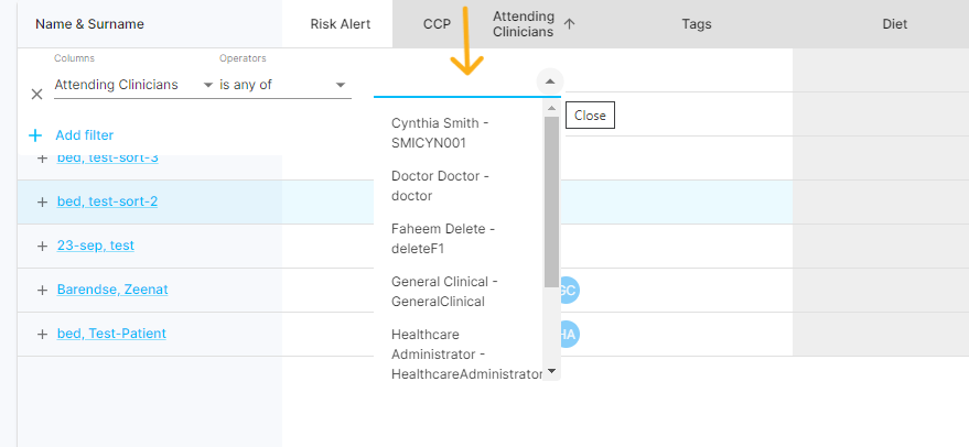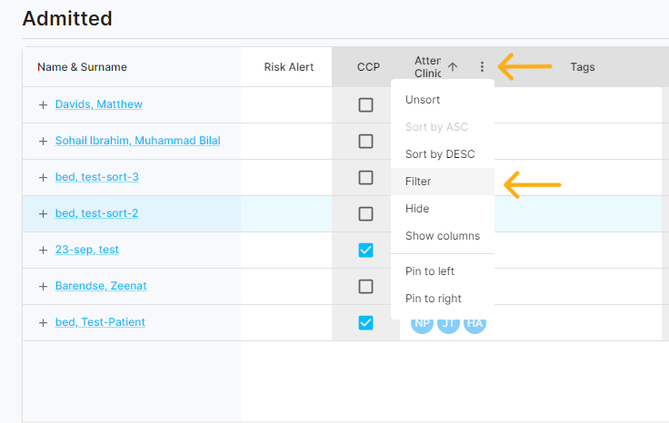 Following the assignment of your patients, you can then click on the three dots located in the header column of "Attending Clinicians" and opt for the "Filter" function.