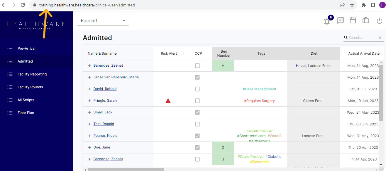 Your client code, or care group, corresponds to the lowercase name of your facility without any spaces. You can locate this code in the URL bar before the term "Healthware."
