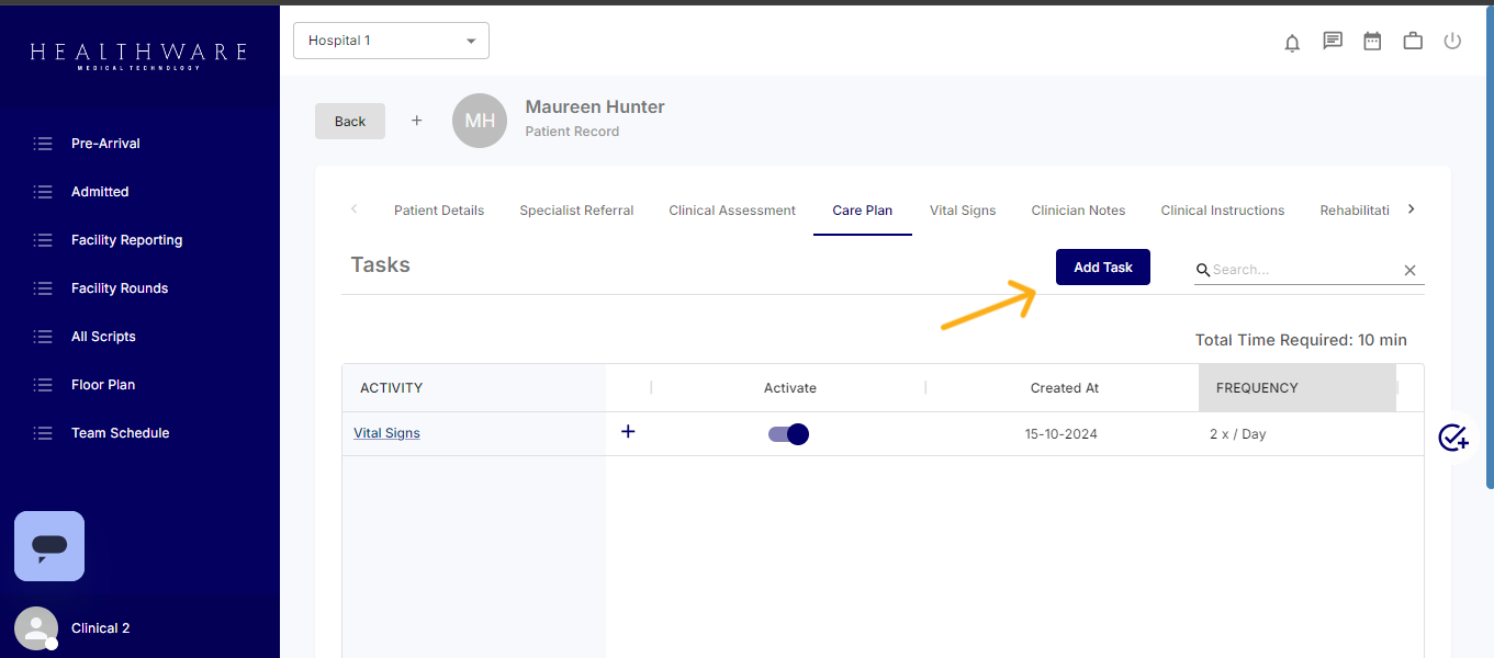To access this feature, navigate to the patient’s record and select the Care Plan option. From there, you can set up the patient’s care plan and schedule recurring events. To add a specific Care Plan task, simply click on "Add Task.