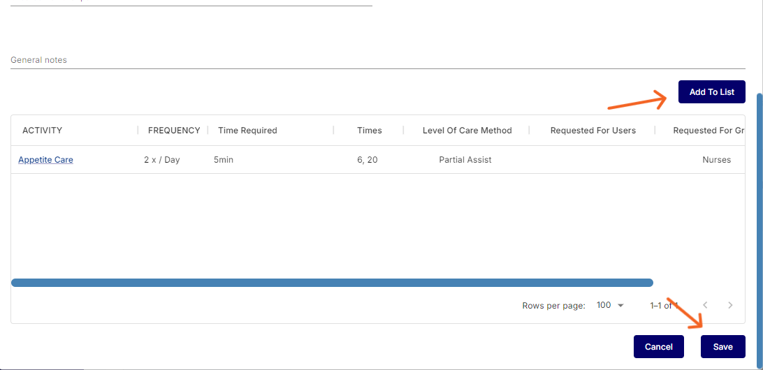 Additionally, specify the duration in minutes needed to complete the task. A general notes section is available for adding any extra details about the task. Once satisfied, click "Add" on the left side of the screen. The task will then appear below in the modal. You can add multiple care tasks by repeating the above steps. Once your care plan is fully complete, scroll down and click "Save."