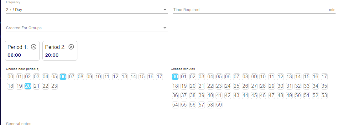 To begin, select an activity from the dropdown list and assign users or groups to the task—carer and nurse groups are recommended. Next, specify the required Level of Care Method. Then, choose the frequency for the task, whether hourly, daily, twice a day, weekly, or monthly. If "twice a day" is selected, the system will prompt you to define two specific time slots within the day. Users will need to set the exact time for each slot by selecting the hour and minute for each occurrence.