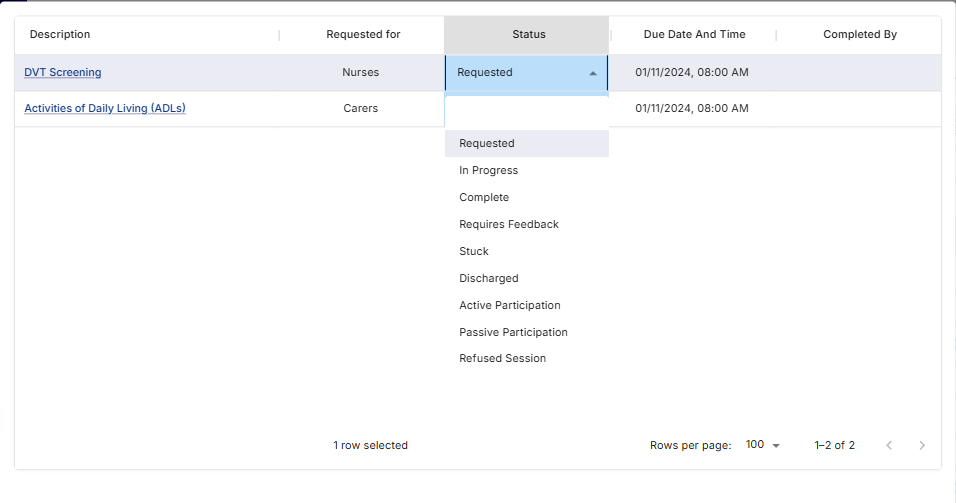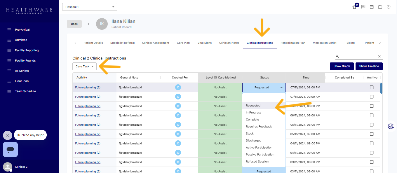 To streamline the workflow and reduce the need to navigate through multiple patient record pages, click on the suitcase icon in the top-right corner of the screen and select "Care Tasks." This will display a comprehensive list of care tasks for all patients in the facility. From this screen, users can easily update the status of each task by choosing the appropriate option from the dropdown menu in the status column.