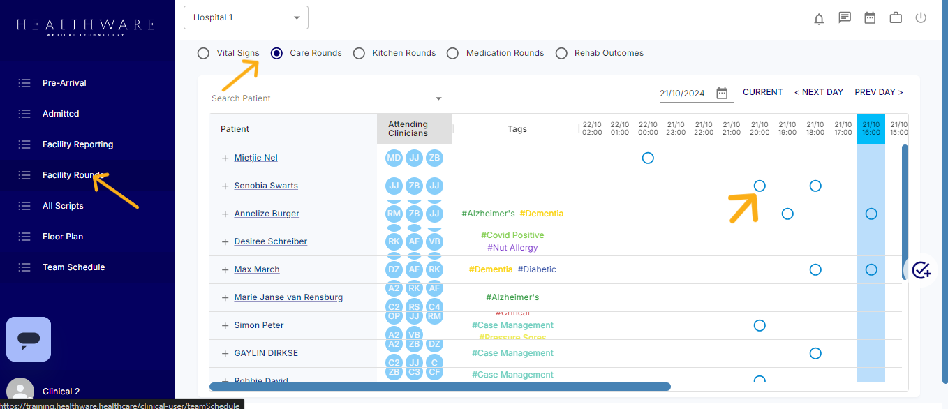 Alternatively, by selecting "Facility Rounds" from the left-hand menu, you can access a list of all patients with their scheduled tasks and corresponding times. Use the navigation buttons above the timeline to move backward or forward, allowing you to review completed tasks and identify any pending ones.