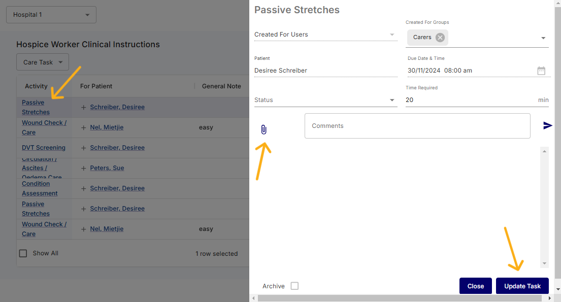 On this screen, users can also update the status of each task by clicking on the blue circle next to the patient's name. A new window will appear, displaying the number of tasks due at that time and providing the option to update each task individually.