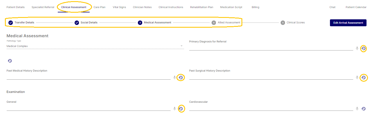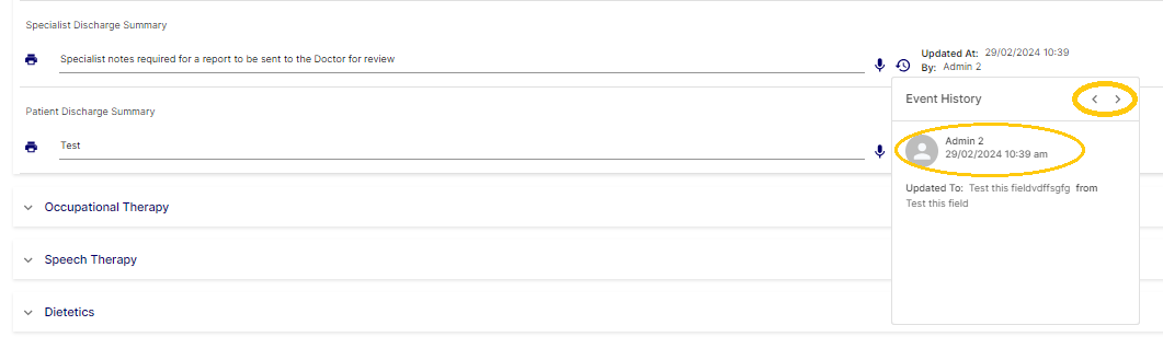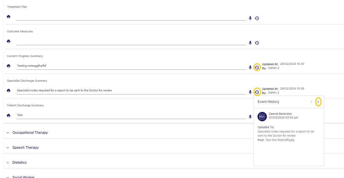 All the fields in Rehabilitation Plan and Clinical Assessment has a version control icon, this allows the user to see what changes were made to that field, when the changes were made and who made the changes.