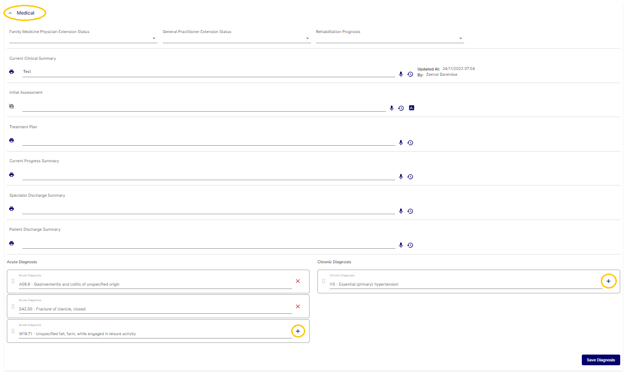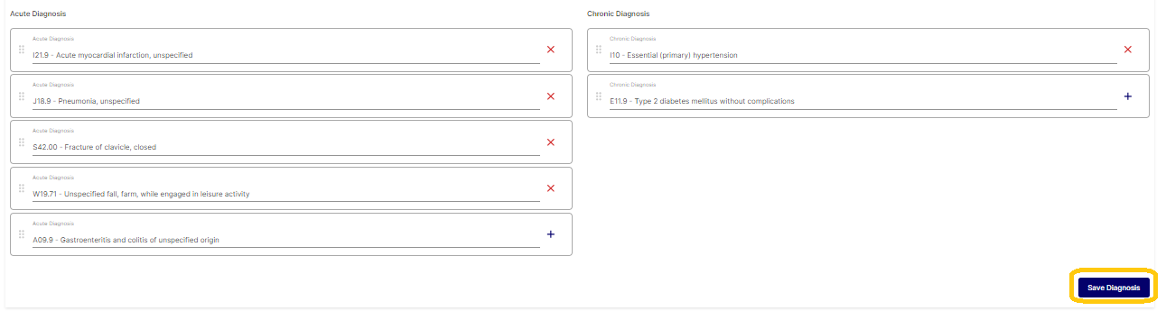 Doctors and Case Managers are able to review and update Acute and Chronic diagnoses / ICD10 codes from the Rehabilitation Plan screen. Click the + sign to add additional codes or the x sign next to the code to be deleted. The user can drag and drop the codes in the correct sequence if needed and then click Save Diagnosis once complete.