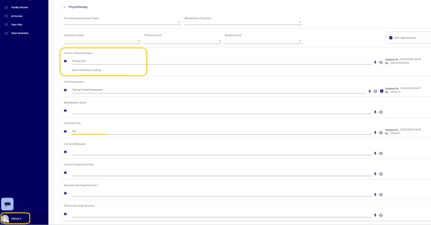 Field locking when another user is accessing, here I'm logged in as Clinical 1 and it shows that user Zeenat Barendse is typing in the Physiotherapy accordion, in the Current Clinical Summary field.