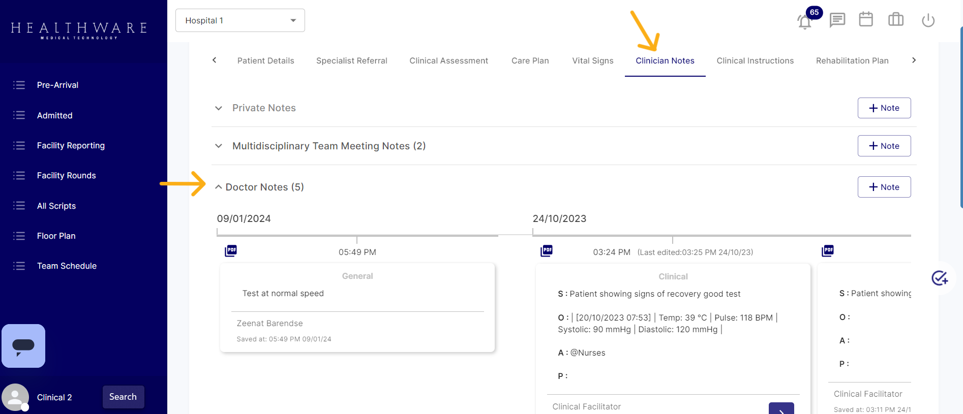 Upon reaching the "clinician notes" tab, users should open the relevant accordion by clicking on the dropdown arrow next to the discipline. This action will reveal the specific notes associated with that discipline, containing the necessary details for generating the PDF sick note or consultation record.