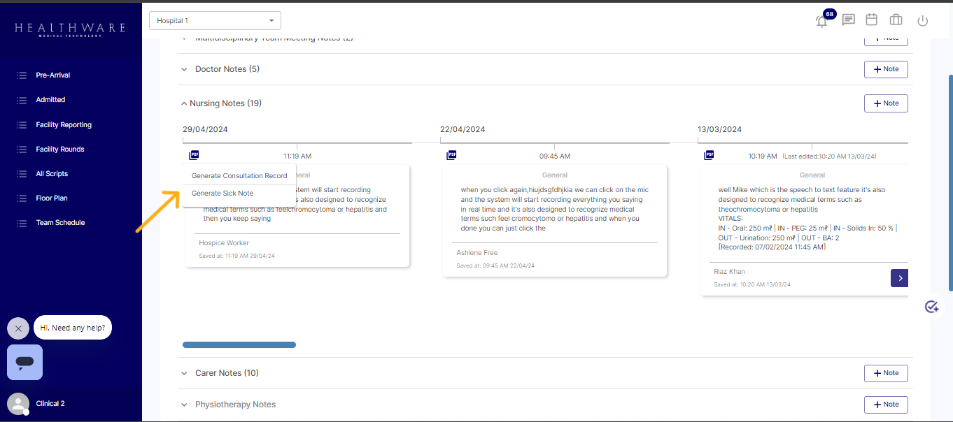 Once the relevant accordion is opened, users can search for the specific note they wish to generate into a PDF sick note or consultation record. In the top left corner of each note, there is a small PDF icon. Clicking on this icon will prompt the system to provide two options: "generate a sick note" and "generate a consultation record." Users can select the appropriate option based on their needs.