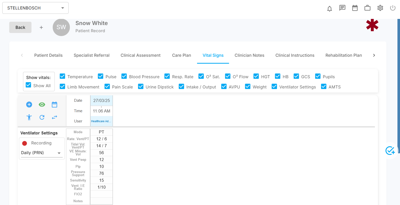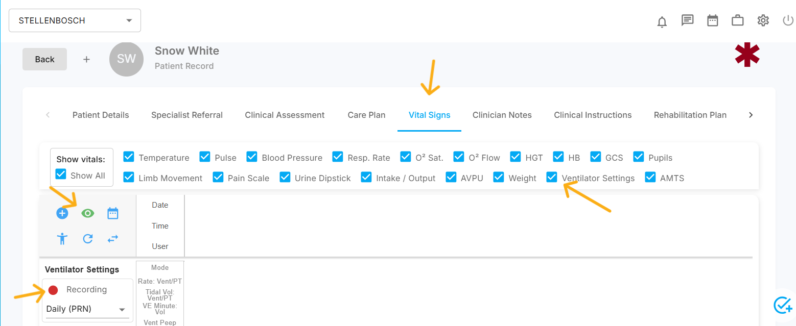 After logging into Healthware, access the patient record for which you need to add the ventilator settings. Once inside the record, navigate to the "Vital Sign" tab and click the eye symbol to view the list of vitals available in the system. Locate the ventilator settings checkbox and ensure it is ticked. Additionally, verify that the recording button next to the ventilator timeline field is activated.