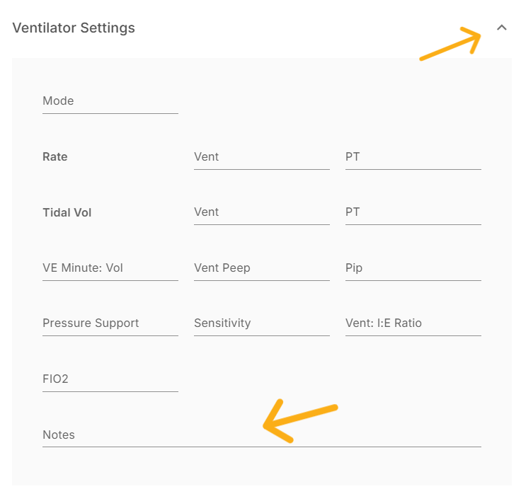 To add the ventilator setting, click the "+" symbol located next to the eye icon. Once the next screen appears, scroll down to locate the ventilator setting accordion. Click on the accordion to expand the field, then complete all the necessary fields with the relevant information. After entering the details, scroll to the bottom of the screen and click the "Save" button to save the captured settings. Additionally, you can use the notes field to add any supplementary information as needed