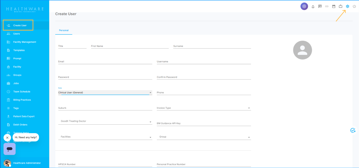 To create a guest user, navigate to the settings icon in the top-right corner of the screen, then from the left-hand menu, select Create User.