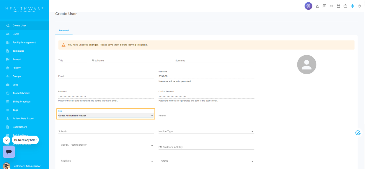Before entering any of the user’s details, select the Role as Guest Authorized Viewer. Once this is set, the username and password are automatically generated.
