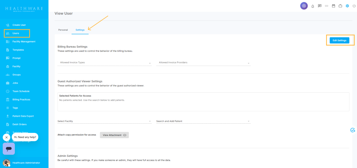To link patients to the guest user, open their user profile, select Settings from the horizontal menu.