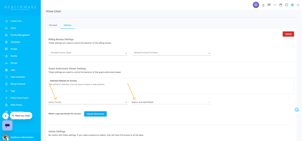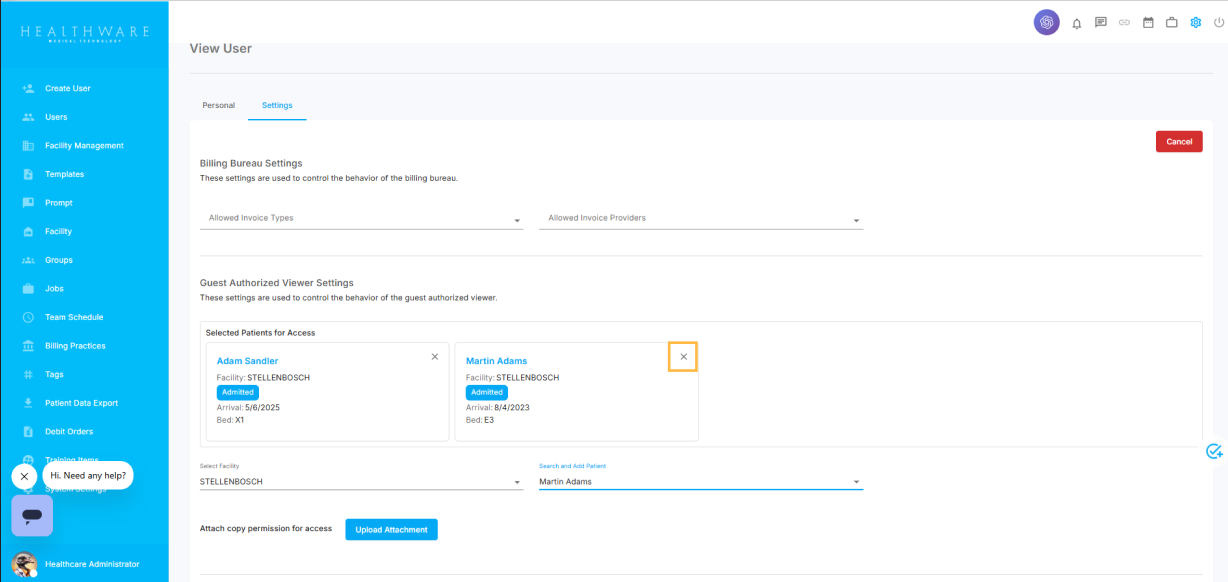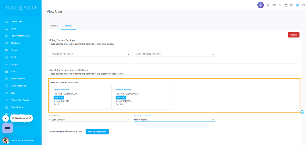 Under the Guest Authorized Viewer Settings section, navigate to the Select Facility field and choose the facility where the patient is admitted. Please note that only a single facility can be selected at a time.