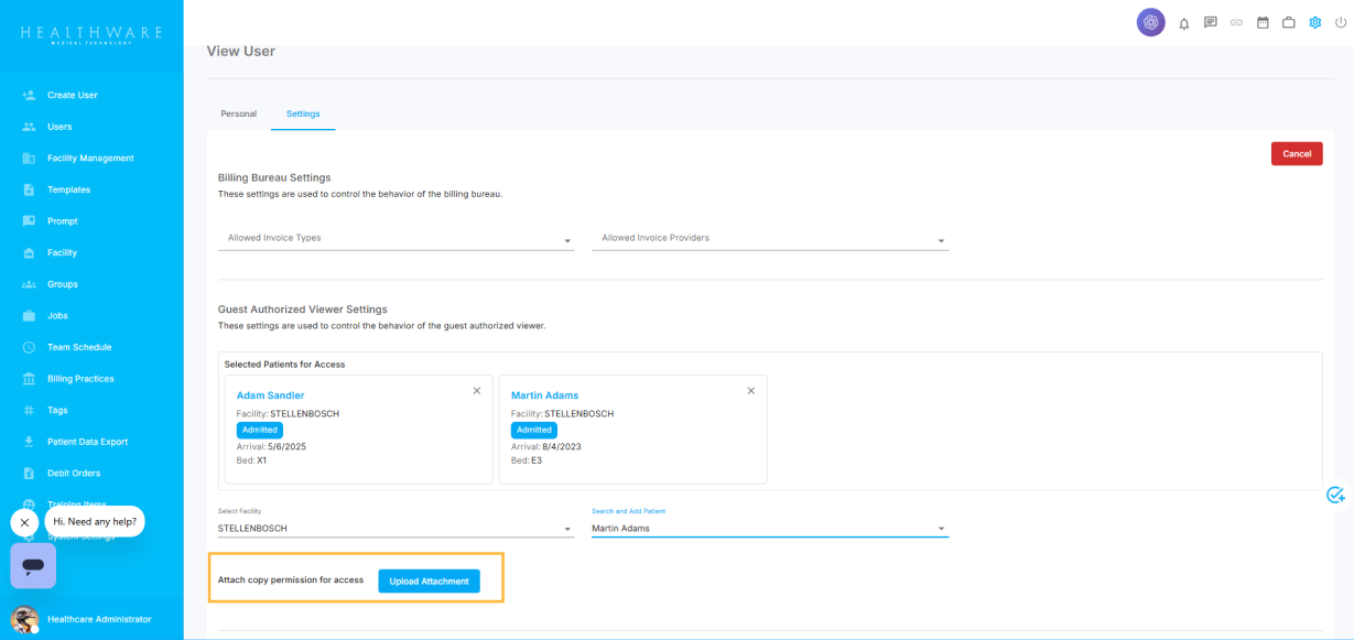 This user role is designed for external parties who request access to a patient’s file, with the patient’s explicit permission. Access is read-only and limited to the specific patients they are approved to view and can only be created by a Super Admin user. This user can be used for the Discovery Health Co-Ordinator, they can be granted access to only their patients.