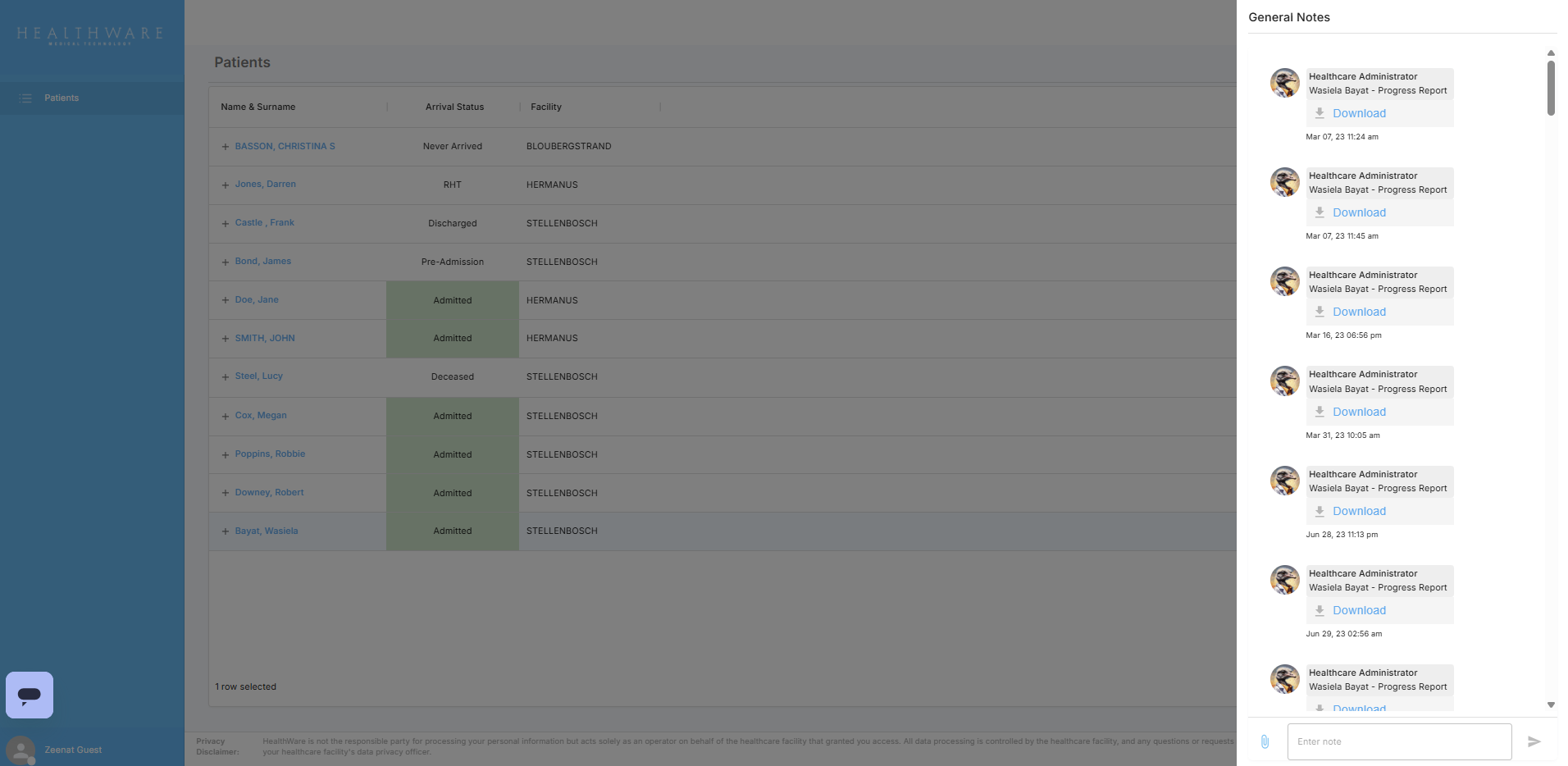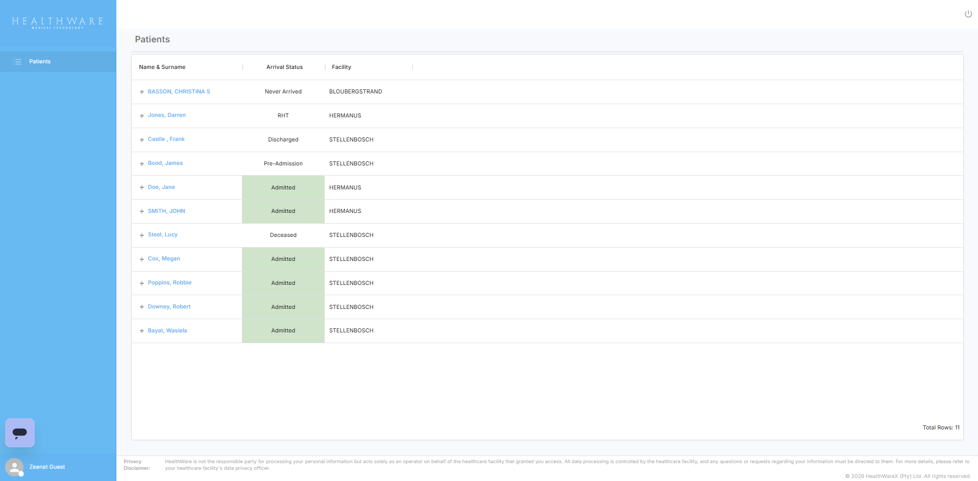 When the Guest Viewer logs into HealthWare they will have access to the list on patients they've been allocated, as view only, the Arrival Status and Location of the patient will also be displayed for ease of reference.