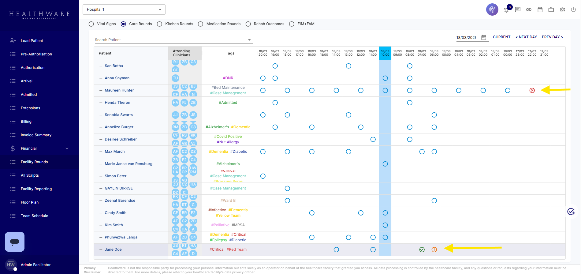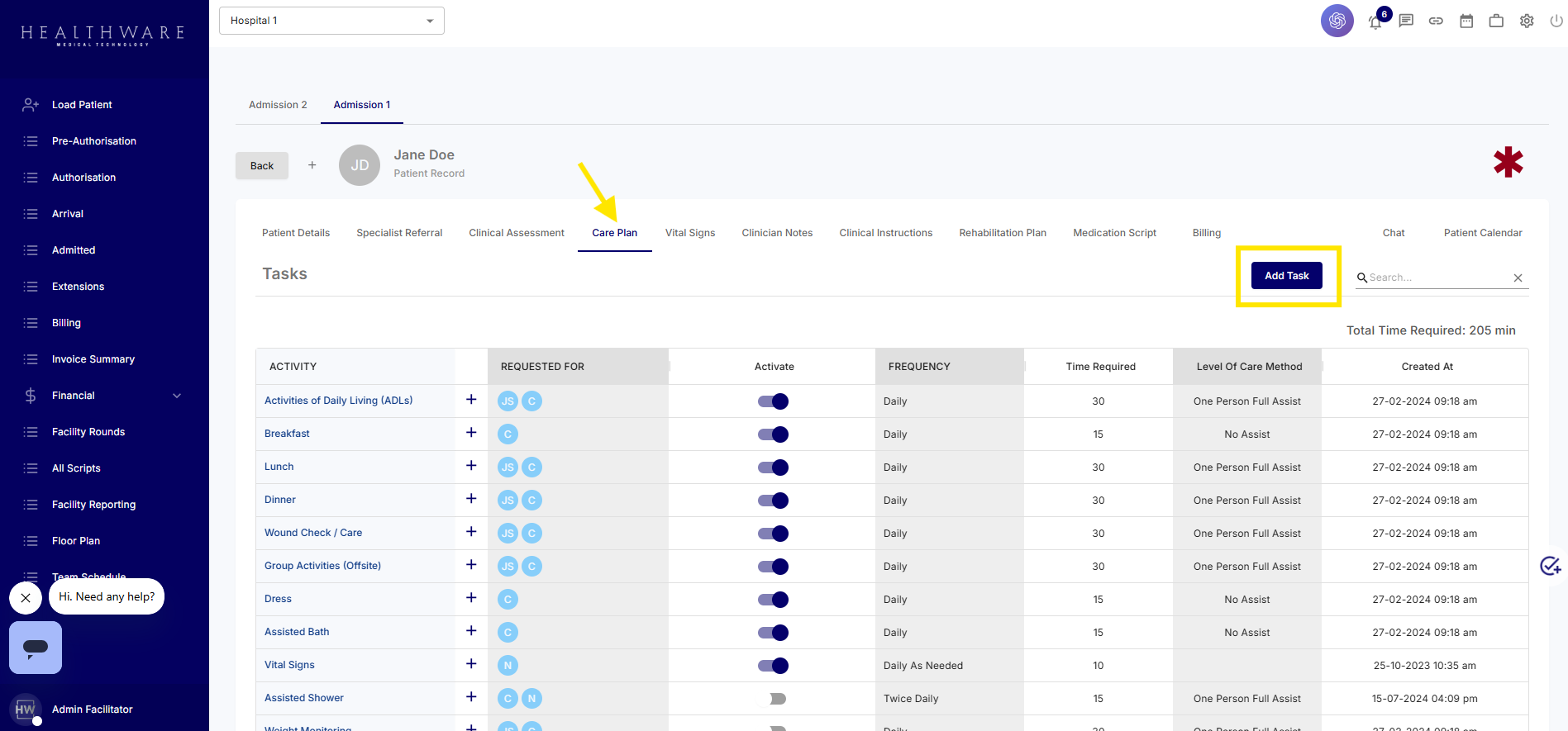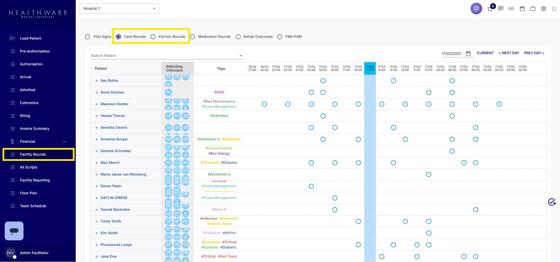 Alternatively, instead of navigating between multiple patient profiles to manage and track care tasks, you can select Facility Rounds from the left-hand menu and click on Care Rounds from the horizontal options. This provides a consolidated view of all patients in the facility, along with their scheduled tasks and corresponding times.
