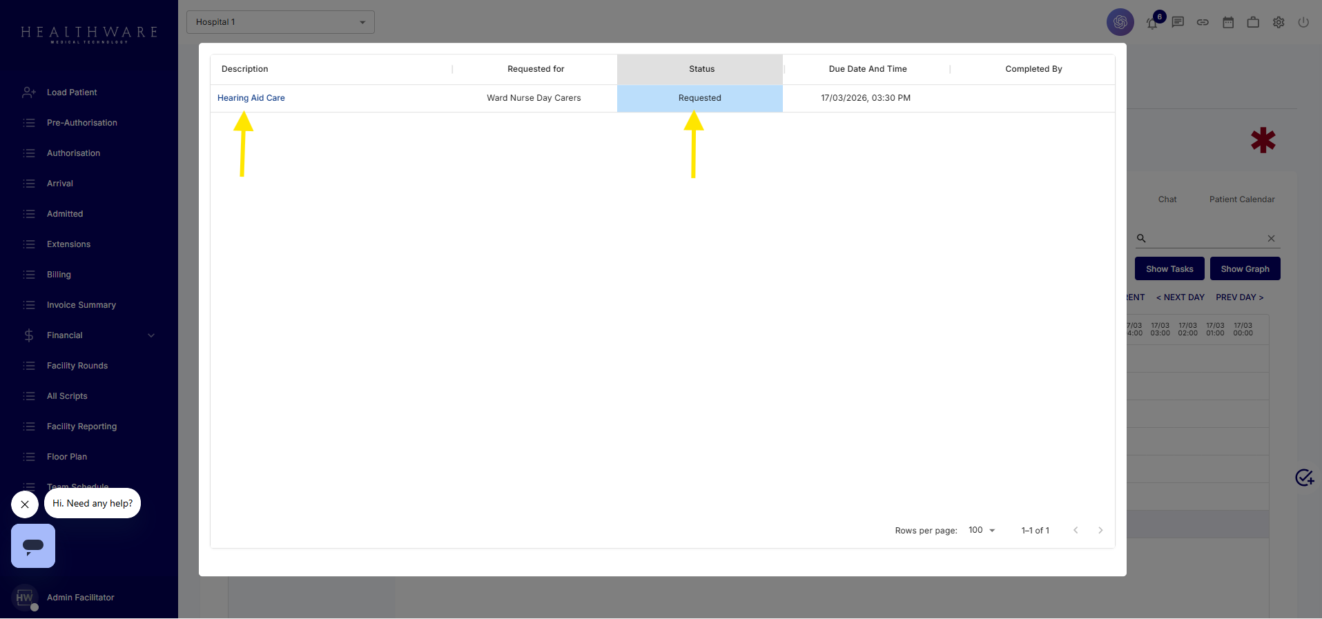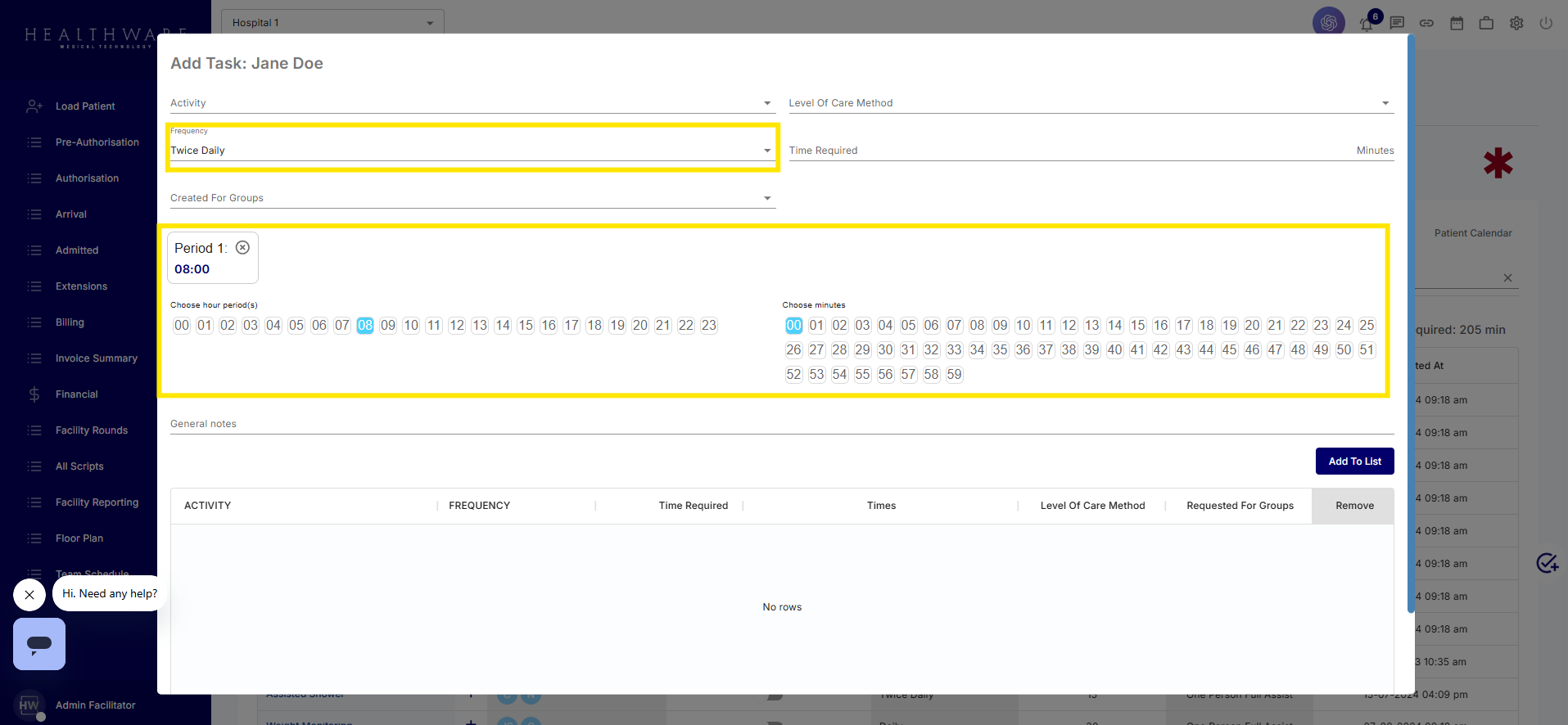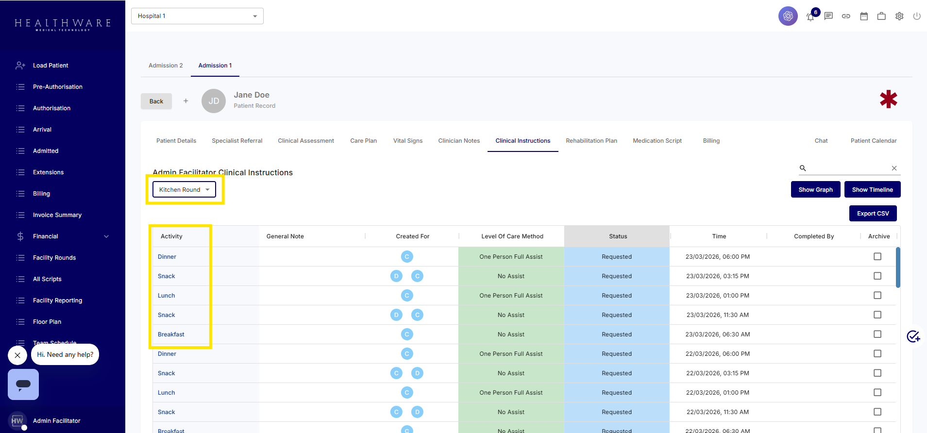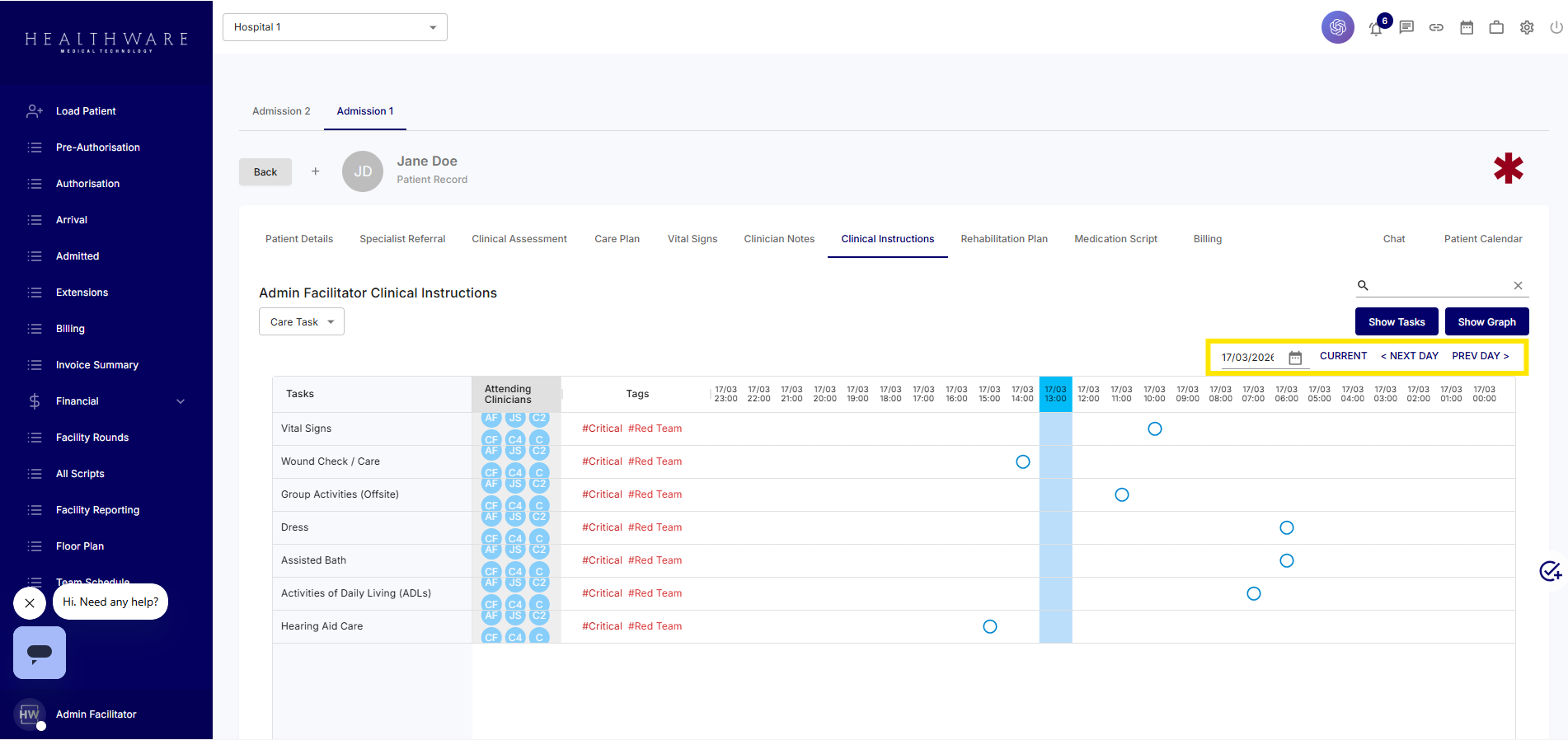 Alternatively, instead of navigating between multiple patient profiles to manage and track care tasks, you can select Facility Rounds from the left-hand menu and click on Care Rounds from the horizontal options. This provides a consolidated view of all patients in the facility, along with their scheduled tasks and corresponding times.