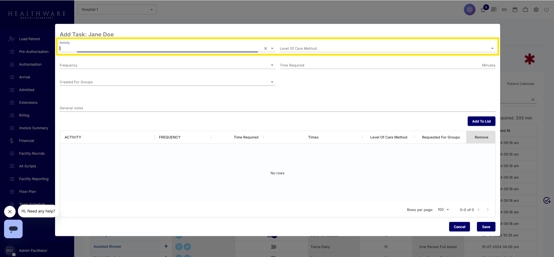 When the form opens, begin by selecting the Activity from the dropdown list and specifying the required Level of Care.