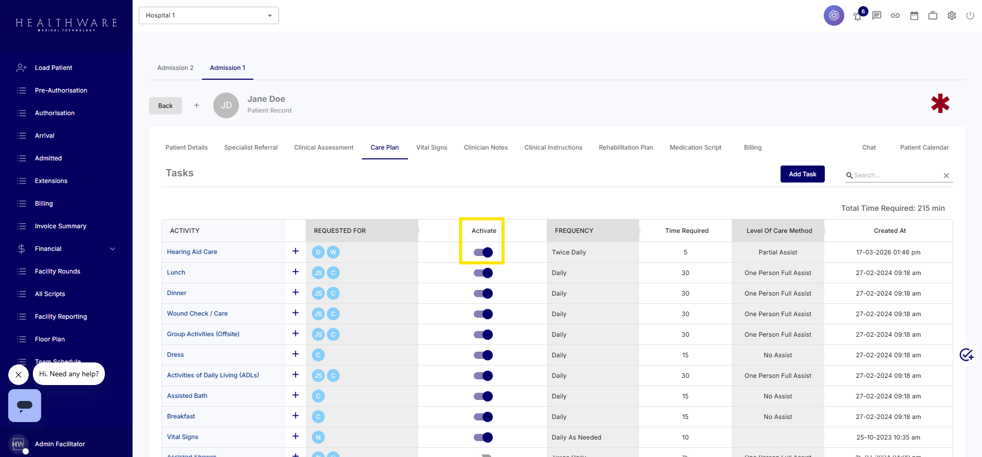 If a care task is no longer valid, you can deactivate it by toggling the Activate slider to deactivate. Please note that once a care task has been deactivated, it cannot be reactivated.