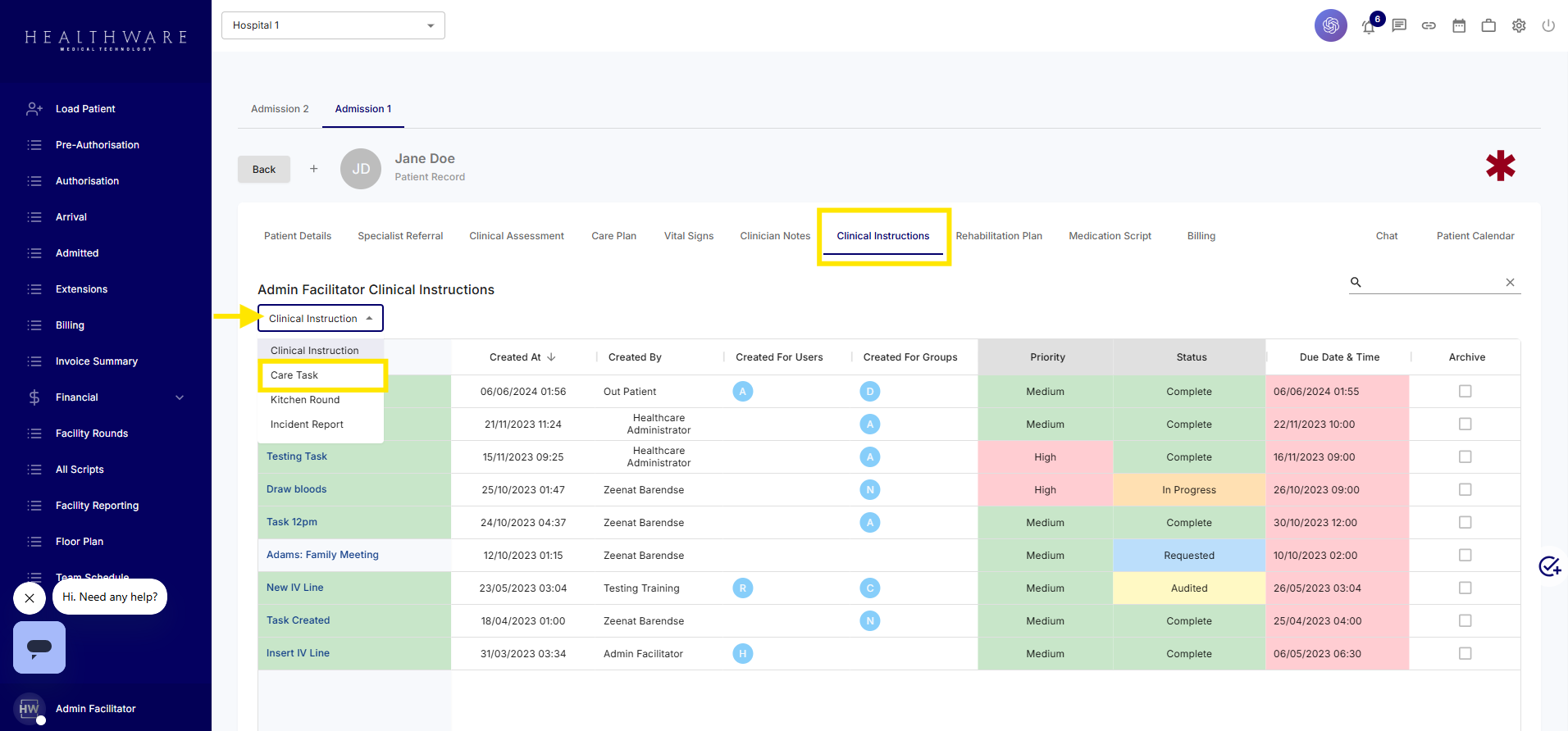 Once completed, navigate to the Clinical Instructions section in the patient record and select the Care Tasks from the dropdown options.